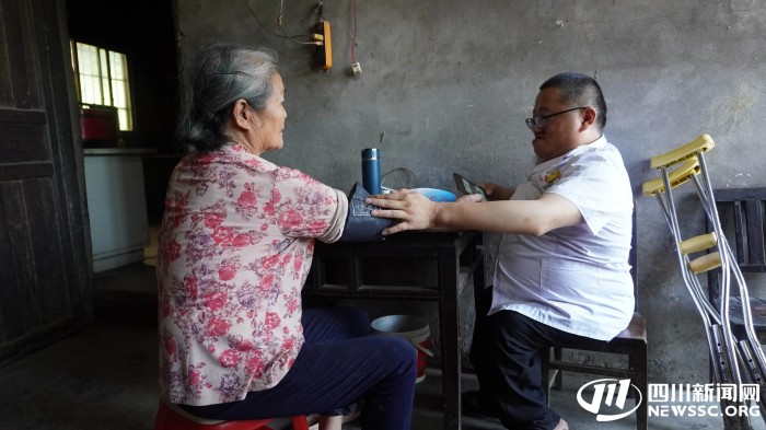 朱月辛为村民量血压。(图片源于四川新闻网 记者余开洋 摄)
