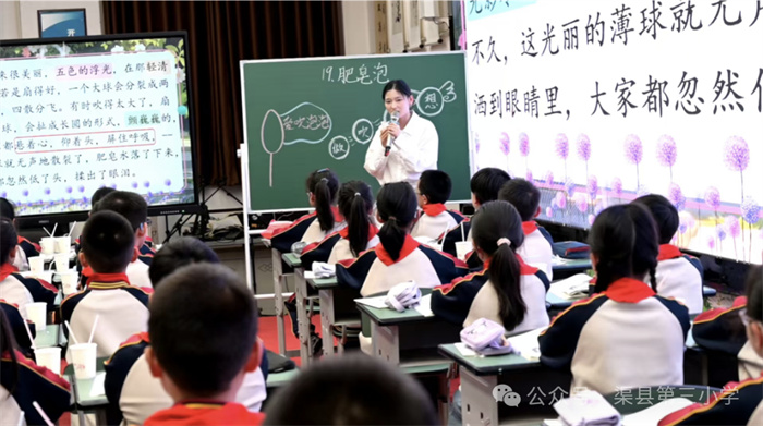 语文+劳动融合课《肥皂泡泡》 环节,来自渠县龙凤镇中心学校的汤诗宇老师以“趣”为核心,通过动手实践引导学生梳理吹肥皂泡的完整流程,落实语言表达训练,结合文本细读带领学生感受肥皂泡的形态之美,将童真主题从课文落地到学生的生活体验,实现读写结合、知行统一。