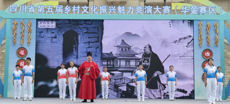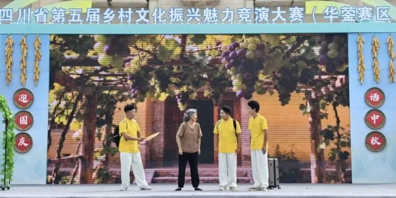 竞演大赛在国家级非物质文化遗产“华蓥山滑竿抬幺妹”《抬出幸福来》欢快的表演中拉开帷幕。随后,来自12个乡镇(街道)的代表队轮番登场,采用“乡镇代言+特色文化展演”的形式开展竞演,生动展现了各地独具特色的民俗文化和乡村振兴新风貌。