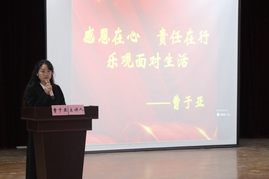 当天下午3点,全国首届孝老爱亲道德模范曹于亚在该校报告厅带来了一场以“感恩在心、责任在行,乐观面对生活”为题的专题报告。在现场,曹于亚结合自身“捐肾救父”“带父上学”的真实经历,以朴实真挚的语言,讲述了在家庭面临重大考验时,如何以坚韧的意志和无私的孝心,勇敢承担起家庭责任,并在逆境中坚持求学、积极生活的动人故事。