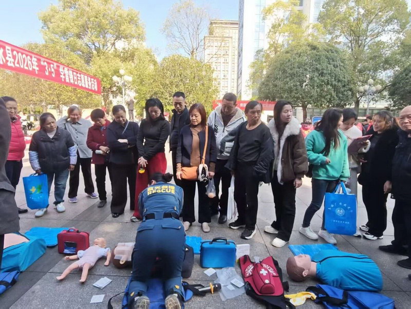 “按压的时候要快而有力……”急救知识培训区,县蓝天应急救援队队员们一边现场演示心肺复苏、气道异物梗阻急救等专业操作,一边讲解动作要领,还邀请群众亲手实操,手把手指导纠正,让大家在沉浸式体验中掌握实用急救技能。