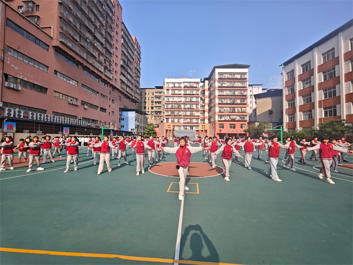 伴随着广播体操音乐的响起,各年级学生依次登场,风采各异。高年级率先亮相,动作沉稳有力。伸展、扩胸、踢腿、跳跃,一招一式精准到位,诠释着“健全人格、锤炼意志”的体育精神。紧随其后的中年级学生朝气蓬勃,动作虽不及高年级老练,却多了几分认真与热忱。转体精准,扩胸有力,节奏分明,他们以饱满的热情磨砺着意志。最后登场的低年级小朋友童真烂漫,他们努力挺直腰板,动作稚嫩却格外卖力,汗水挂额角,笑容写脸上,正是“享受乐趣、增强体质”的本真模样。