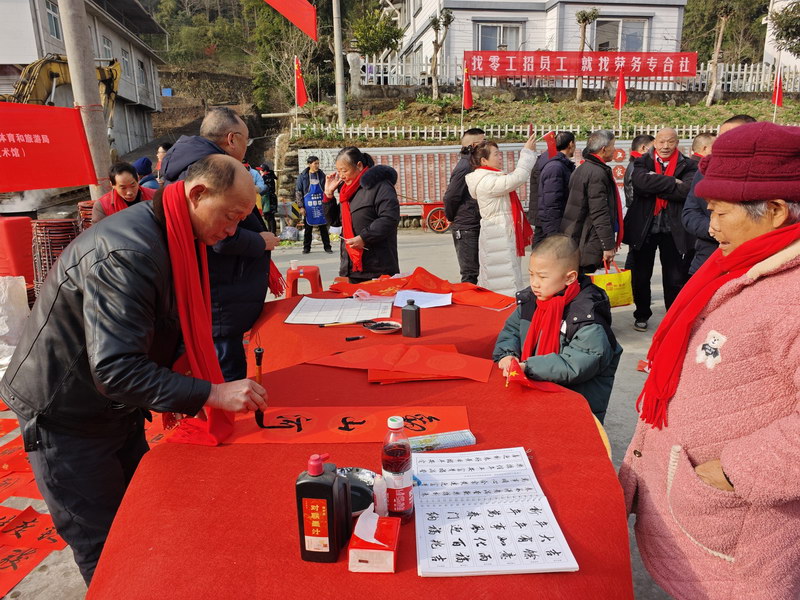 “很热闹!这氛围多久没见过了,就跟小时候办酒席一样热闹。”从新疆务工返乡的群力村居民何树忠一边等待春联干透,一边感慨。在他身旁,60岁的群力村居民王光辉与几位老邻居正热络地聊着家常,商量着一会儿坝坝宴坐哪桌。
