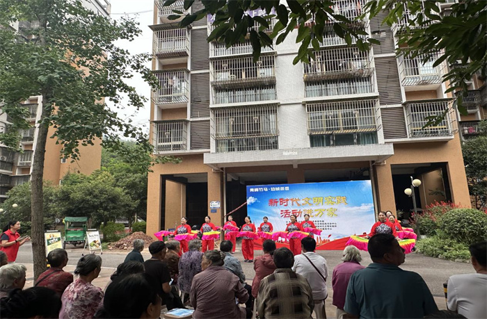 活动在马边山歌协会带来的《兰花花》舞蹈中拉开序幕。演员们身着蓝色花布服饰,彩色的扇子轻转如兰花瓣绽放,舞姿灵动飘逸,将彝乡儿女的柔情与坚韧演绎得淋漓尽致。随后,经典曲目《马边山歌》唱响,原生态的唱腔里藏着茶马古道的故事,引得台下老人跟着节奏拍手哼唱。“没想到在家门口能看到这么地道的表演,这才是咱们马边人自己的文化!”小区居民王阿姨笑着说。