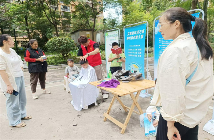 活动设文明实践惠民专区与文明互动专区。惠民专区中,专业理发师为老人、儿童等群体免费理发,缝补志愿者修补衣物传递温情;文明互动专区通过图文展板展示社区治理、文明新风等内容,志愿者讲解文明养犬、移风易俗规范,“有奖问答”围绕健康知识、文明行为设题,居民抢答获赠礼品,在互动中深化科学文明生活方式认知。