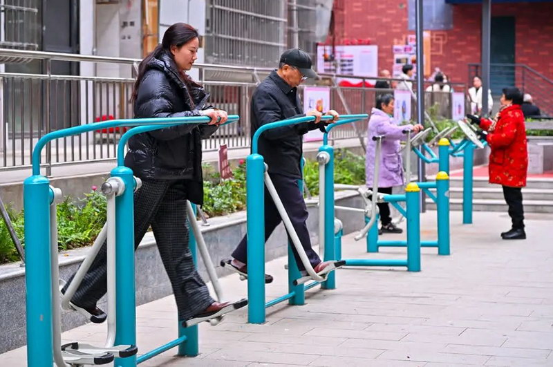 在文林街道陵州社区纺兴苑小区内,居民正在锻炼。