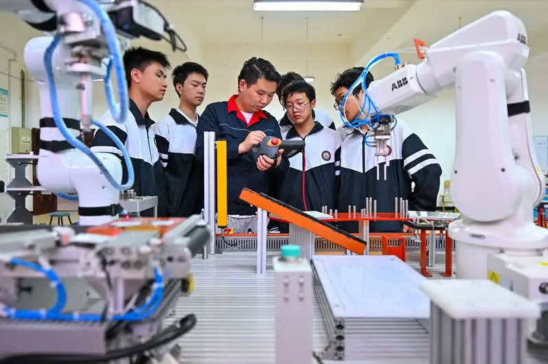 在职教中心,教师正在实训基地向学生讲解工业机器人的操作要领。