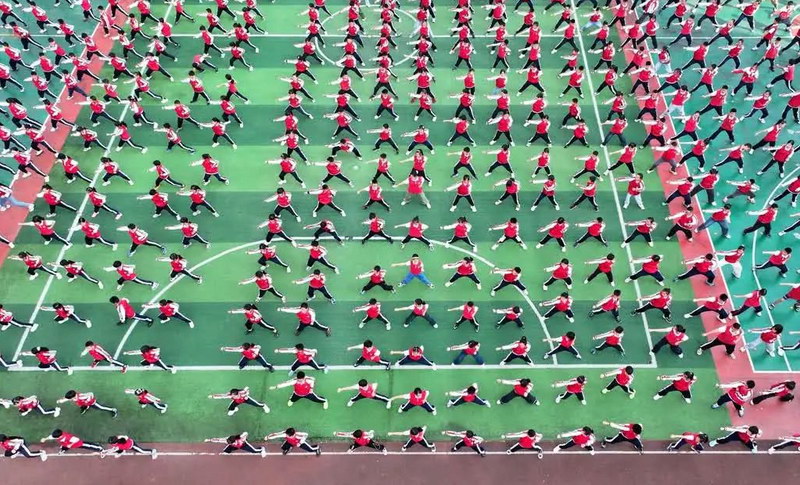 东方红小学校的学生利用课间在操场上练习武术。