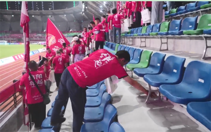 比赛落幕,观众有序离场,无拥挤、推搡现象,观众主动将手中的饮料瓶、零食袋投入垃圾桶。离场后,志愿者们迅速拿起工具清理看台。短短30分钟,散落的纸巾、饮料瓶被尽数收走,看台恢复整洁如初。这一幕被德阳球迷看在眼里,纷纷点赞:“绵阳青年志愿者真给力,热情又讲文明!”