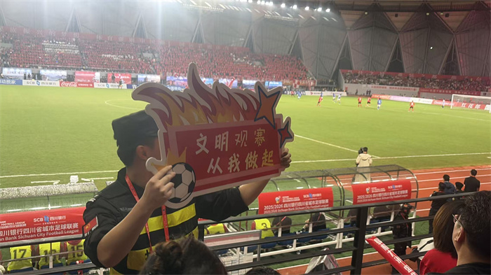 赛场内外,120余名身着蓝色马甲的青年志愿者忙碌不停。“文明川超 精彩有我”主题打卡框前格外热闹,观众或与同伴并肩,或携家人同框,一张张笑脸定格的不仅是观赛瞬间,更是对文明观赛的主动承诺。4个检票口旁的“暖心便民”志愿服务站里,《绵阳市文明行为促进条例》《三台县市民文明手册》整齐摆放,观众等候时可随手翻阅;通道入口处,文明提示语音循环响起,与志愿者的忙碌身影形成“视听双引导”,让文明悄然融入观赛每一刻。赛场内,随处可见文明提示标识:座椅旁、通道处设有“文明观赛 从我做起”的立牌。志愿者不定时巡查,及时劝阻个别观众起身遮挡他人视线的行为,全程无一起因观赛引发的冲突。