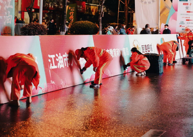 赛后,文明引导员们并未离场,他们化身“清洁卫士”,沿着赛道不间断巡查,弯腰捡拾遗留的零星杂物,协助工作人员整理隔离设施。与此同时,刚刚退至幕后的环卫工人们再次登场,开启了一场与时间赛跑的“复原行动”。“这边还有个纸杯,我捡一下。”扫帚的沙沙声与路人的赞叹声交织在一起,路过的一位市民感叹道:“这么多人聚在一起,跑完还能这么干净,咱们江油人真是好样的!”这一幕幕,恰是江油作为“全国文明城市”深厚底蕴的生动注脚——文明不仅体现在高光时刻的精彩绽放,更落实在曲终人散后的默默守护。