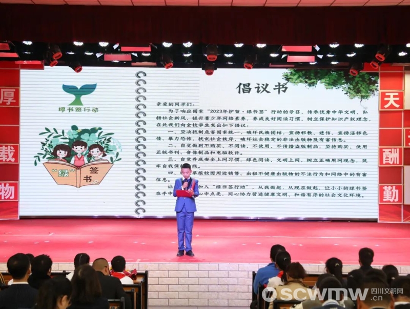 为护助少年儿童健康成长,拒绝有害出版物和信息,引导学生们绿色阅读、文明上网,自觉抵制有害出版物及信息,全力筑牢绿色阅读的安全防护墙,学生代表马海龙云现场发起绿书签行动倡议,并为大家推荐了他心中的好书,展现了同学们“好读书、读好书”的阅读热情与追求。