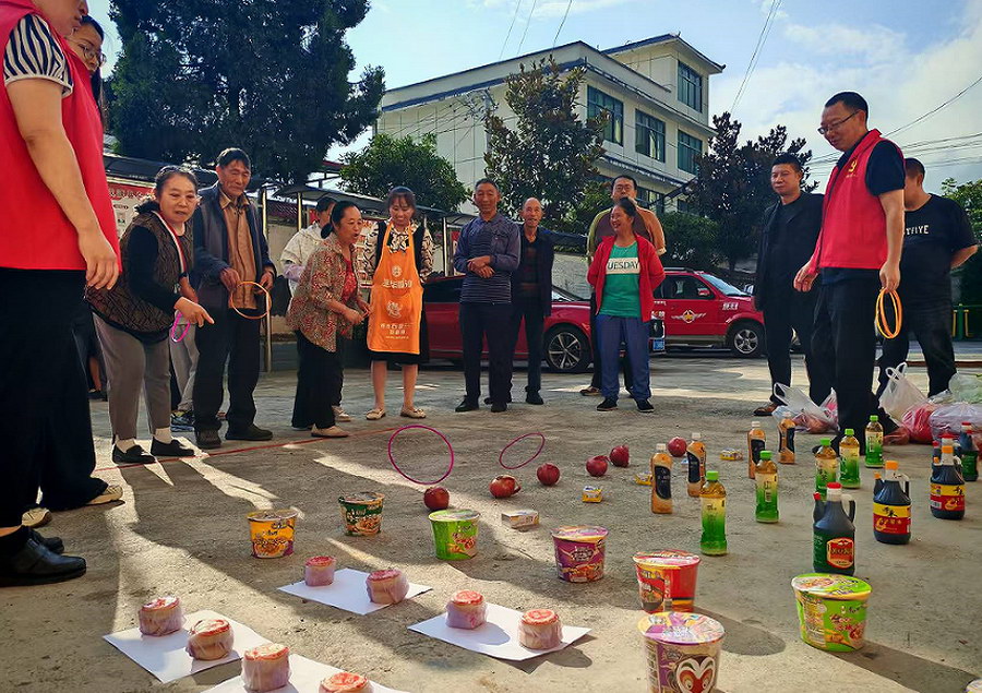 9月27日,乌斯河镇新时代文明实践所在马托村活动广场开展“家国同庆·月满人间”庆国庆迎中秋趣味活动。辖区群众踊跃参与,活动现场气氛热烈。活动设有玉兔套圈圈、月宫投壶、蒙眼敲锣、欢乐赶“鸡”、巧手剥玉米五个趣味活动项目,大家玩得不亦乐乎,加油声此起彼伏,现场成了欢乐的海洋。最后,志愿者们为现场群众送上香甜可口的月饼,大家边品尝边畅享喜悦,欢声笑语构成一幅邻里同乐的和谐画面。