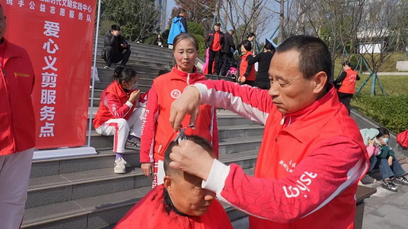 广场四周,各志愿服务团队的展示点连接成一条温暖的“公益长廊”。这里没有距离,只有心与心的贴近。医疗志愿者正耐心为老人测量血压,轻声叮嘱健康事项;公益理发师悉心为市民免费修剪头发……