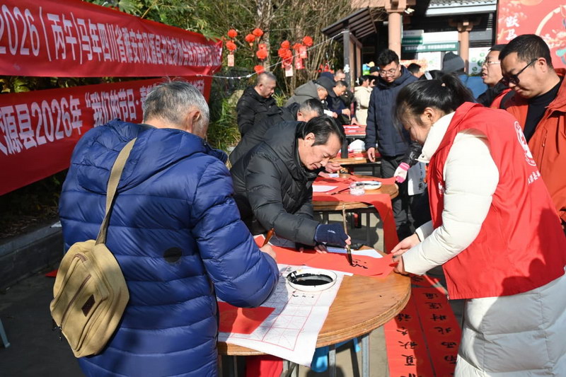 汇演舞台侧畔,年味同样浓郁。书法惠民区案头铺展着喜庆的红宣纸,当地书法爱好者及文化志愿者挥毫泼墨,笔走龙蛇间,一副副满载吉祥祝福的春联、一张张寓意美好的“福”字新鲜出炉,墨香四溢,承载着对新年最美好的祈愿,被争先恐后的乡亲们欣喜领取。