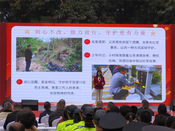 活动中,思政微课堂《约定》感人至深。讲述人以朴实语言生动讲述了中国好人杨兴海一家三代接力守护红军墓的感人事迹。自1935年起,杨家与红军立下守护之约,祖父、父亲和杨兴海三代坚持守护近百年,并持续为红军烈士寻亲,传承红色记忆。红军墓迁至烈士陵园后,他仍常带孩子们前往祭扫,以实际行动诠释诚信与担当,让长征精神在新时代焕发光彩。