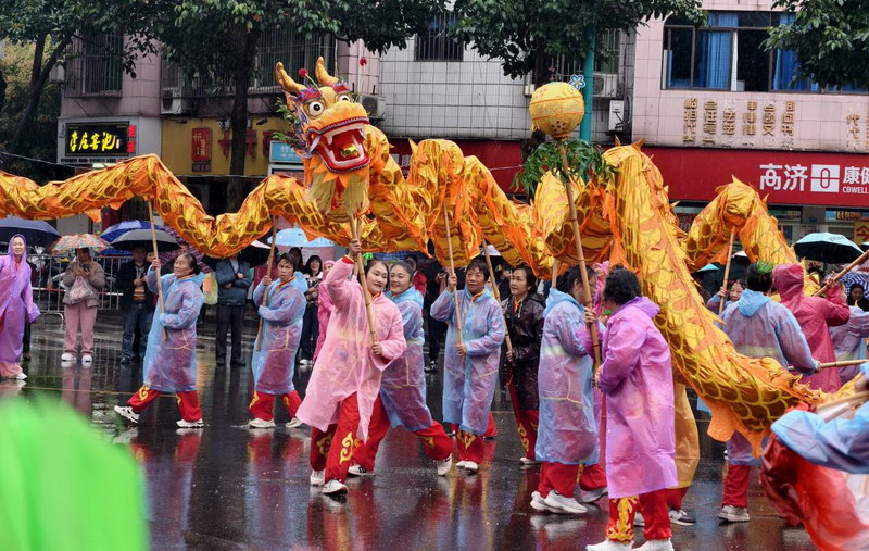 “划旱船”的演员身着彩衣,伴着锣鼓节奏轻盈迈步,栩栩如生的“竹马”在街头穿梭,福禄寿喜财五福人偶沿街巡游,向群众挥手致意、派送吉祥,现场群众纷纷撑伞驻足,拿出手机在“我在长宁县新时代文明实践中心过佳节”的合影点前打卡,与舞龙队伍合影留念。