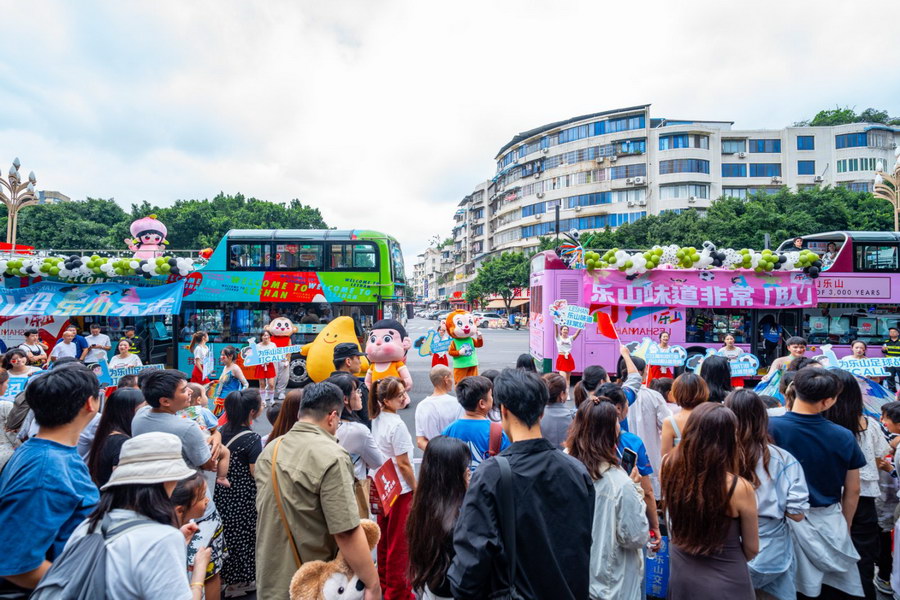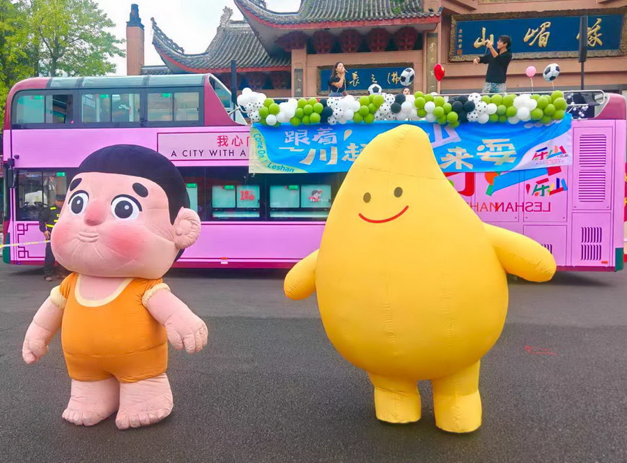 攀枝花市东区、乐山两地文旅部门“足球音乐双层巴士”,化身移动的甜蜜据点,在峨眉山市区巡游。图源:攀枝花东区融媒