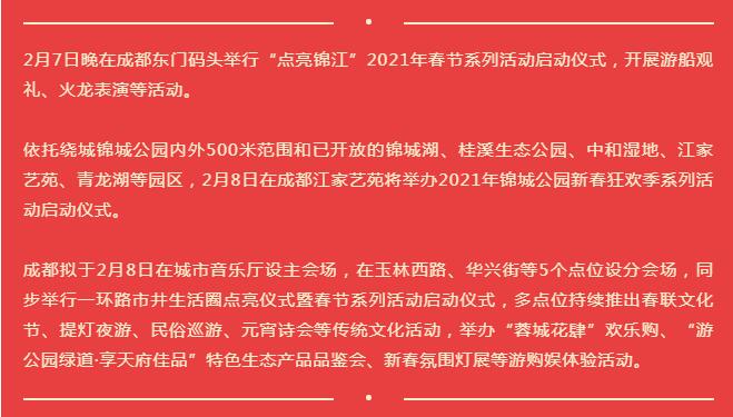 成都大熊猫繁育研究基地将推出“2021年新春幼年大熊猫室外亮相活动”、洛带古镇将通过“客家山歌送兴旺”“祥瑞金牛送福气”“客家龙舞送吉祥”“客家祈福送如意”等系列特色民俗活动,向游客讲述客家春节文化符号,表达新春祝福。