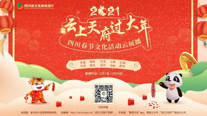 日前,由四川省文化和旅游厅主办的“2021云上天府过大年”云展播大型新春线上活动在四川省文化和旅游厅官方网站和微信公众号、“智游天府”文化和旅游公共服务平台APP和微信公众号以及省内电信、移动、联通、广电网络电视正式上线。