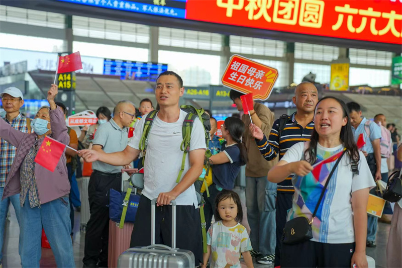 10时30分,成都市文化馆四季风女声合唱团、街头艺人吴斯琦、谭劲豪等,带领现场旅客共同演唱《歌唱祖国》《我和我的祖国》《灯火里的中国》《红旗飘飘》《成都》等经典歌曲,旅客们挥舞国旗齐声合唱,歌声汇聚成对祖国的深情告白。来自西安的董先生正等候返程高铁,他全程投入合唱,激动地说:“来成都出差恰逢这场活动,能和大家一起为祖国祝福,特别开心,愿祖国越来越好!”