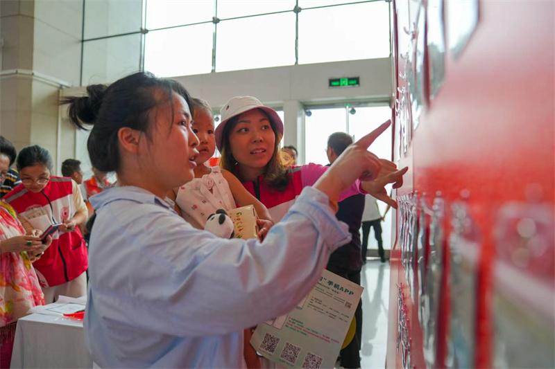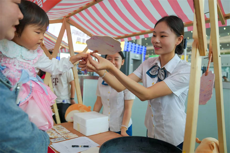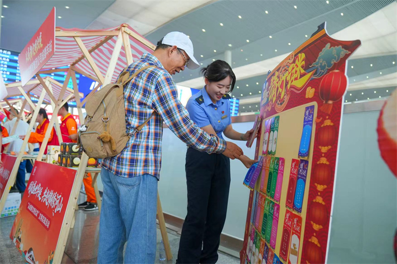 歌舞环节结束后,候车厅内的“文明集市”热闹开市,为旅客们的国庆之旅增添了一抹亮丽的文明色彩。非遗漆扇体验、趣味套圈……中国铁路成都局集团有限公司成都车站、成都地铁运营有限公司运营二公司在活动现场打造的文明旅游、文明出行趣味互动区,吸引了众多旅客踊跃参与。