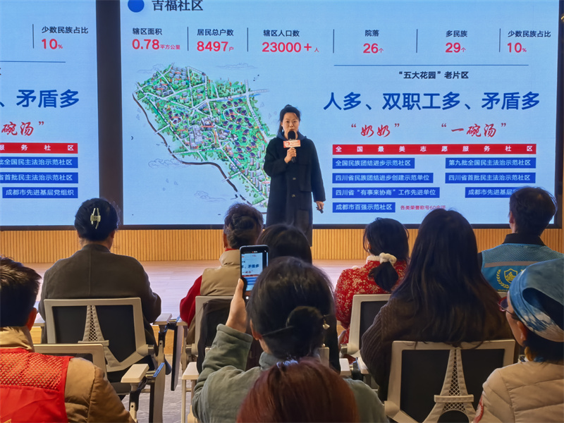 全国最美志愿服务社区武侯区吉福社区副书记向南南分享了“从‘共享奶奶’汤碗边读懂志愿温度”的故事。(罗园 摄)