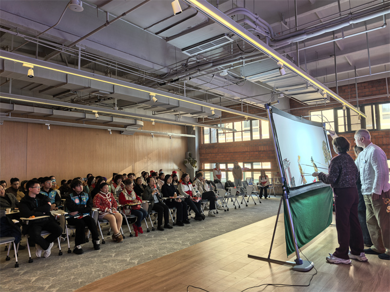 四川省十佳志愿者、成都皮影艺术博物馆馆长赵洪及团队表演皮影戏《猪八戒吃西瓜》。(罗园 摄)