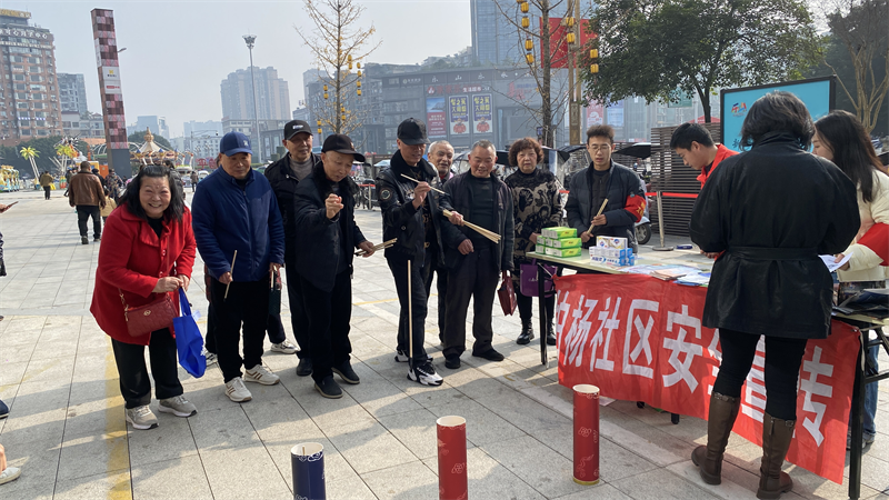除精彩演出外,现场的惠民服务与趣味活动区域也备受市民欢迎。健康义诊台前,医护人员为市民测量血压、提供健康咨询;便民服务区提供反诈宣传等服务;趣味活动区同样人气高涨,投壶等简单有趣的小游戏吸引众多市民挑战,获胜者还可领取香皂、牙膏、抽纸等实用小礼品,现场充满欢声笑语。