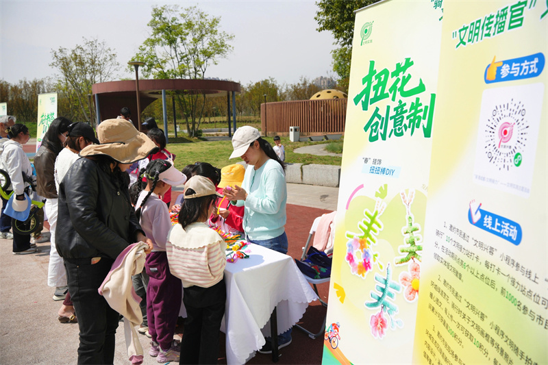 亲子志愿者制作并赠送扭扭花,向市民宣传文明赏花理念。向真 摄
